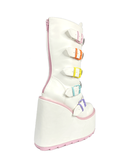 These are cute on another level! Be THE valentine all year-round with these white and pink Boots 's with pastel innocence. Charm all your lovelies with a variety of cute inscriptions on candy-like, heart shaped hardware.
